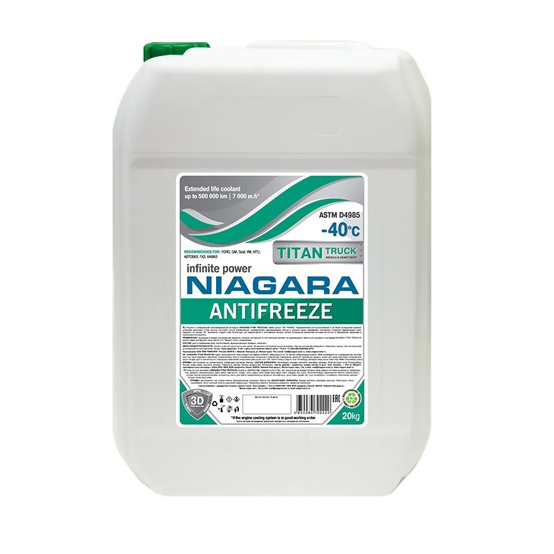 Антифриз «NIAGARA® TITAN Truck- 40» - охлаждающая жидкость (антифриз) премиум класса. Предназначена для использования в системах охлаждения современных высокопроизводительных, тяжелонагруженных двигателей, изготовленных из чугуна, алюминия или сплавов металлов, устанавливаемых на легкую и среднюю коммерческую технику, магистральную технику, карьерную и внедорожную технику, строительную технику, речные суда, маневровые тепловозы, стационарные дизель-генераторы.