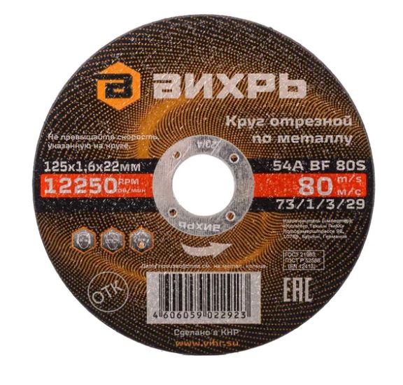 Круг отрезной Вихрь 125х1,6х22мм применяется совместно с угловыми шлифовальными машинами (болгарками) для работ по металлическим заготовкам. Диск можно раскручивать до 12250 оборотов в минуту. Круг имеет высокий запас прочности и технологичную конструкцию.